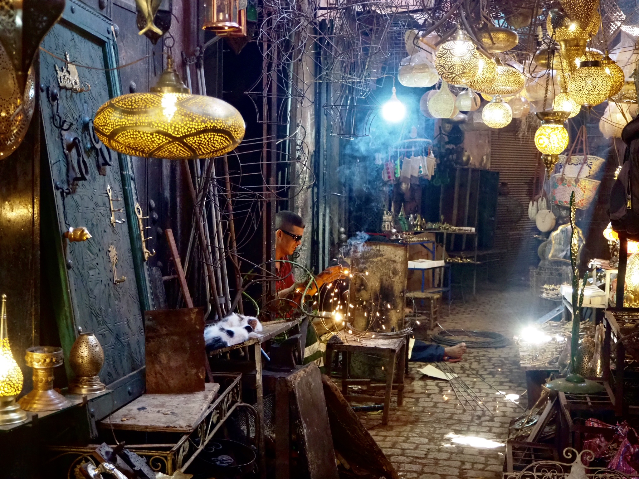 Der wohlverdiente Platz 3 geht an dieses Foto von Lina Wettig. Umgeben vom goldenen Licht der Lampen und Laternen geht ein Schmied auf dem Souk Semmarine in Marrakesch seinem Handwerk nach. Zwei Katzen leisten ihm dabei Gesellschaft.